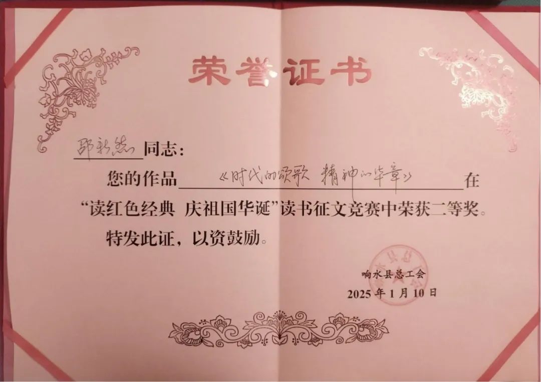 近日,由響水縣總工會舉辦的2024年度“讀紅色經典、慶祖國華誕”職工讀書征文競賽活動結果相繼公布,江蘇響水港物流有限公司業(yè)務組邵新然的《時代的頌歌,精神的華章》在眾多作品中脫穎而出,榮獲征文競賽二等獎。