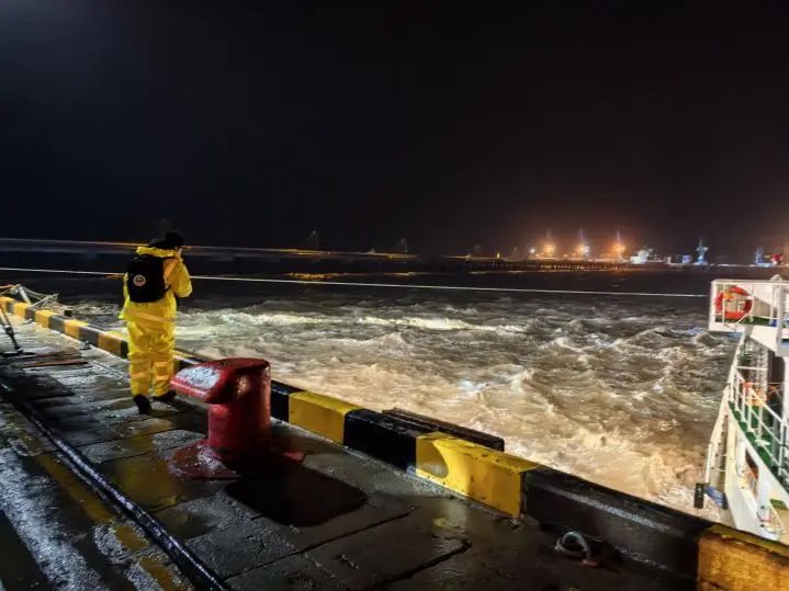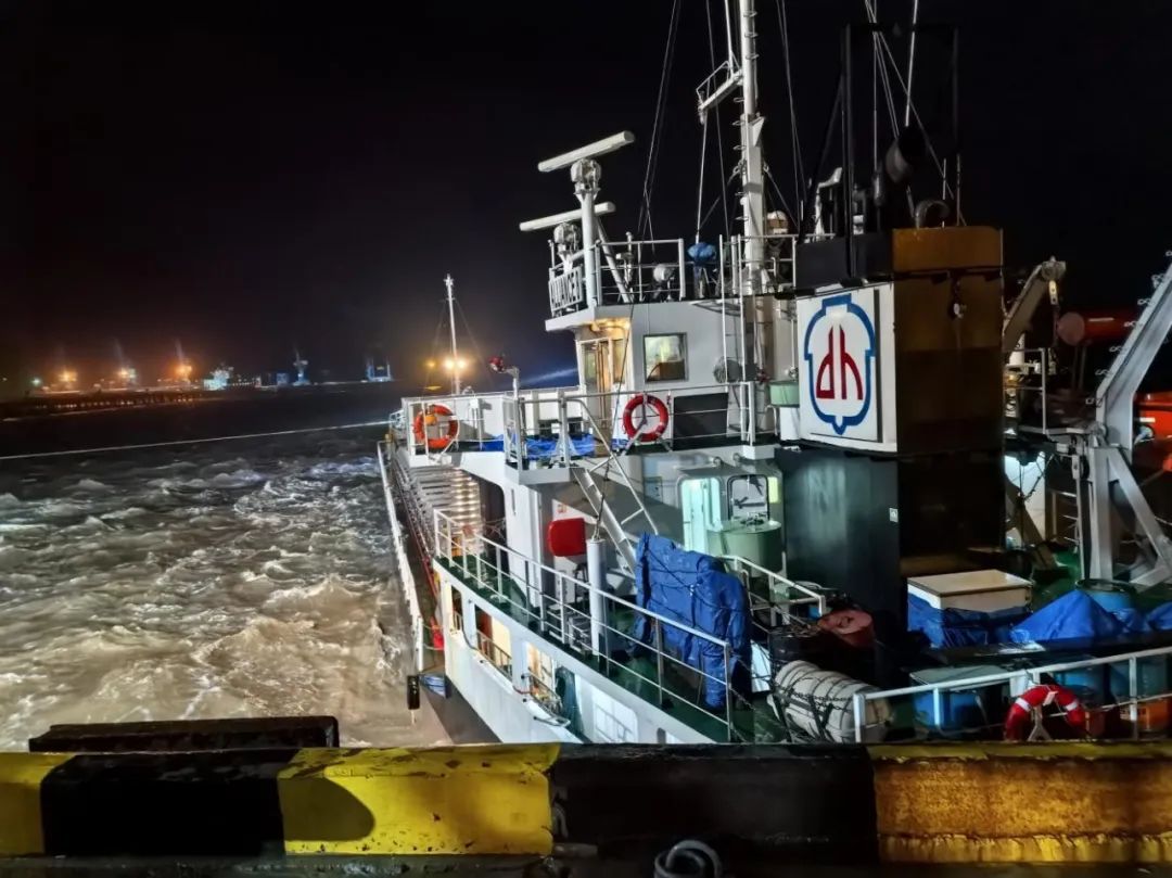 當(dāng)晚正值農(nóng)歷大潮汛,東北風(fēng)6級、涌浪2米的惡劣海況給救援帶來嚴(yán)峻挑戰(zhàn)。引航員抵達(dá)現(xiàn)場時,“聯(lián)盟8”輪船頭僅剩1根倒纜受力,船體與碼頭形成60°夾角持續(xù)后漂,且涌浪過大導(dǎo)致無法登輪指揮。面對險情,引航員在碼頭前沿與交管中心協(xié)同決策,果斷采取“解尾纜、控船位”的應(yīng)急處置方案。