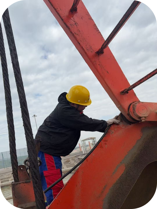 他攀至高聳門機(jī)頂端,低頭細(xì)致檢查設(shè)備,專注各部件運(yùn)行健康狀況。每一次低頭,都是對(duì)設(shè)備安全的守護(hù)。