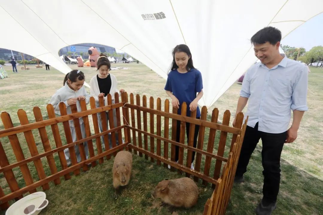 現(xiàn)場的BBQ派對(duì)香氣四溢,烤肉的滋滋聲讓人們沉浸在美食的歡樂中。幾只憨態(tài)可掬的“卡皮巴拉”成為露營區(qū)最受歡迎的“特邀嘉賓”。這些溫順的小家伙或悠閑踱步,或慵懶曬太陽,引得游客紛紛駐足互動(dòng)。“沒想到露營還能遇到這么可愛的動(dòng)物,孩子都舍不得走了!”帶著孩子參加活動(dòng)的王女士笑著說。一旁的兒童樂園里,孩子們?cè)谲E蹺板、攀爬架、小馬搖樂等游樂設(shè)施上盡情玩耍,歡聲笑語不斷,真正實(shí)現(xiàn)了 “熊孩子放電,解放爸媽雙手”。