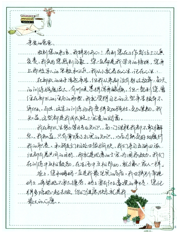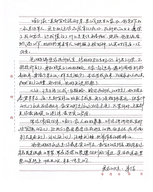 字里行間流露出對(duì)雙親的敬仰之情,細(xì)數(shù)在軍旅或職場中的成長點(diǎn)滴,并鄭重承諾將“忠誠、奮進(jìn)”的家風(fēng)薪火相傳,以實(shí)際行動(dòng)回饋家庭與社會(huì),同時(shí)深切期盼家庭團(tuán)聚的美好時(shí)光。