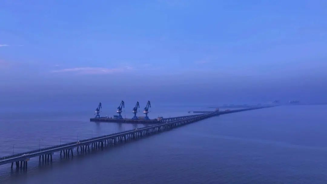 藍調時刻的美,在于它讓工業與浪漫共舞。當夕陽沉入黃海的懷抱,港區的燈塔率先點亮,堆場的集裝箱矩陣褪去白晝的灰藍,漸次染上紫粉的余暉,仿佛莫奈筆下的《干草堆》有了現代工業版;而泊位旁??康木掭?,甲板燈火如珠鏈,與天際殘留的鈷藍云霞交織,構成一幅“海上生明月,天涯共此時”的恢宏長卷。