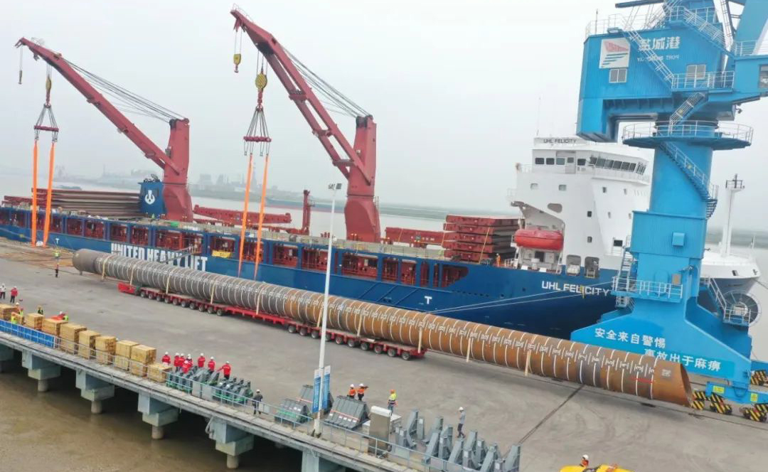 “幸福號”貨輪承載著江蘇天能海洋重工有限公司精心制造的尖端管樁裝備,這些“大國重器”將遠赴中東,為當(dāng)?shù)赜蜌赓Y源開發(fā)提供關(guān)鍵基礎(chǔ)設(shè)施支持。全船共裝載45件管樁及配套鋼結(jié)構(gòu),其中管樁長度普遍超過40米,最長達76.8米,單件最大重量突破377噸,堪稱“海上鋼鐵巨龍”。
