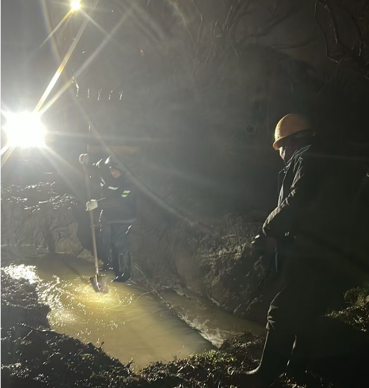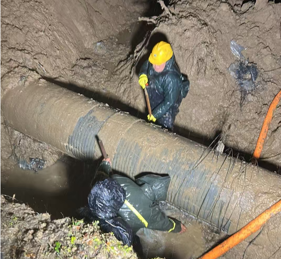 現(xiàn)場(chǎng)指揮與技術(shù)人員冒雨研討,迅速優(yōu)化施工方案,確保各環(huán)節(jié)無(wú)縫銜接。挖機(jī)轟鳴聲中,搶修隊(duì)員跳進(jìn)齊膝深的泥漿中,摸索著查找漏點(diǎn);暴雨如注的深夜里,照明燈下一個(gè)個(gè)躬身忙碌的身影,成了雨幕中最堅(jiān)實(shí)的剪影。從傍晚到深夜,從大雨滂沱到雨勢(shì)漸歇,8個(gè)小時(shí)的連續(xù)奮戰(zhàn),他們未曾合眼、未曾停歇。