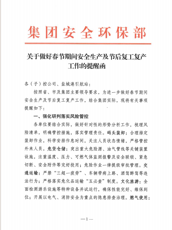 2024年是全面完成“十四五”規劃目標任務的關鍵之年,是集團打造“五新示范港”的突破之年,也是安全生產治本攻堅三年行動的開局之年。集團黨委高度重視安全生產、環境保護、平安建設工作,從行動上落實省、市決策部署,從源頭上消除事故隱患,全力以赴落實落細安全生產、環境保護、平安建設各項工作,持續夯實高質量發展根基。