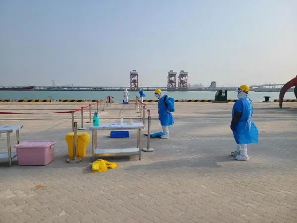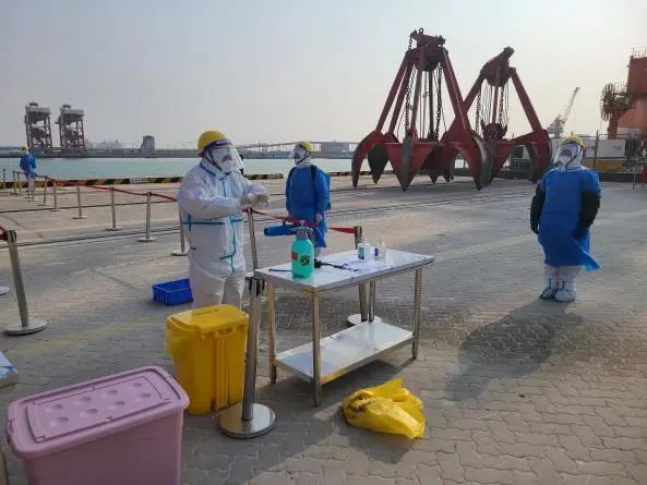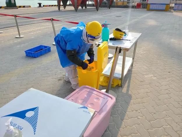 本次演練模擬了濱海港區(qū)通用碼頭2號(hào)泊位發(fā)現(xiàn)疫情之后的相關(guān)處置流程。演練中,碼頭發(fā)現(xiàn)疫情后,及時(shí)將情況進(jìn)行上報(bào),并立即停止作業(yè),同時(shí)迅速對(duì)登船人員進(jìn)行排查,就地隔離,開(kāi)展現(xiàn)場(chǎng)消殺工作。現(xiàn)場(chǎng)成立疫情防控應(yīng)急指揮部,按照指揮部的統(tǒng)一調(diào)度,開(kāi)展應(yīng)急處置,經(jīng)過(guò)妥善處理,演練中的疫情得到有效控制,同時(shí)對(duì)碼頭作業(yè)人員嚴(yán)格執(zhí)行“N+7+7”的閉環(huán)管理,確保濱海港區(qū)碼頭盡快恢復(fù)正常生產(chǎn)。