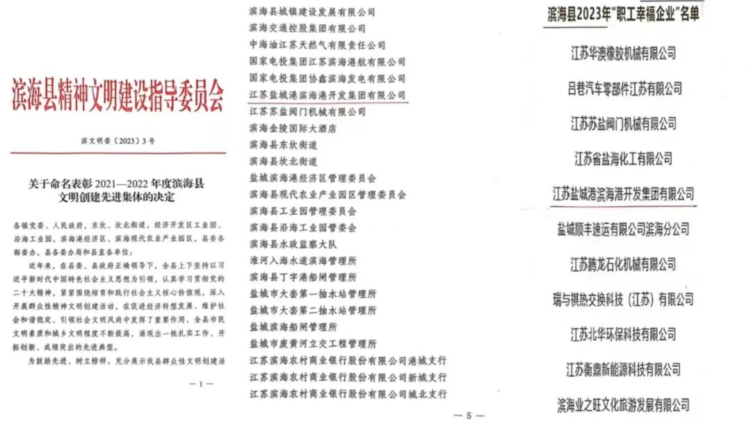 近日,濱海縣總工會(huì)公示了提升職工生活品質(zhì)2021—2022年度縣文明創(chuàng)建先進(jìn)集體、2023年濱海縣“職工幸福企業(yè)”名單,濱海港區(qū)再獲兩項(xiàng)榮譽(yù)。