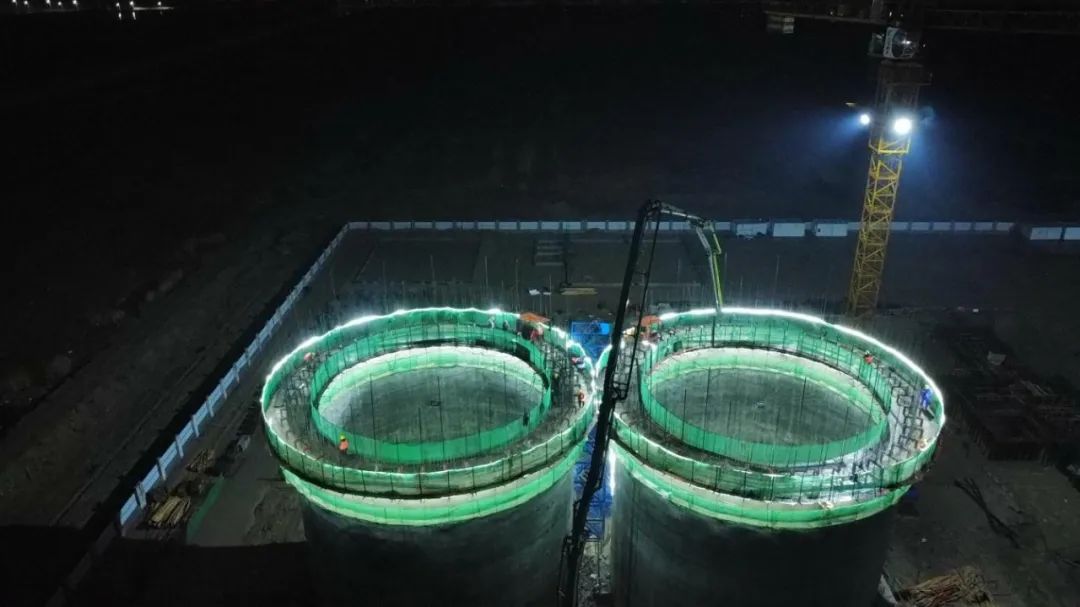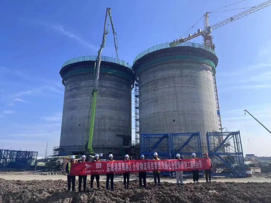 近日,濱海港區(qū)倉儲物流項(xiàng)目首組淺圓倉倉壁順利封頂。