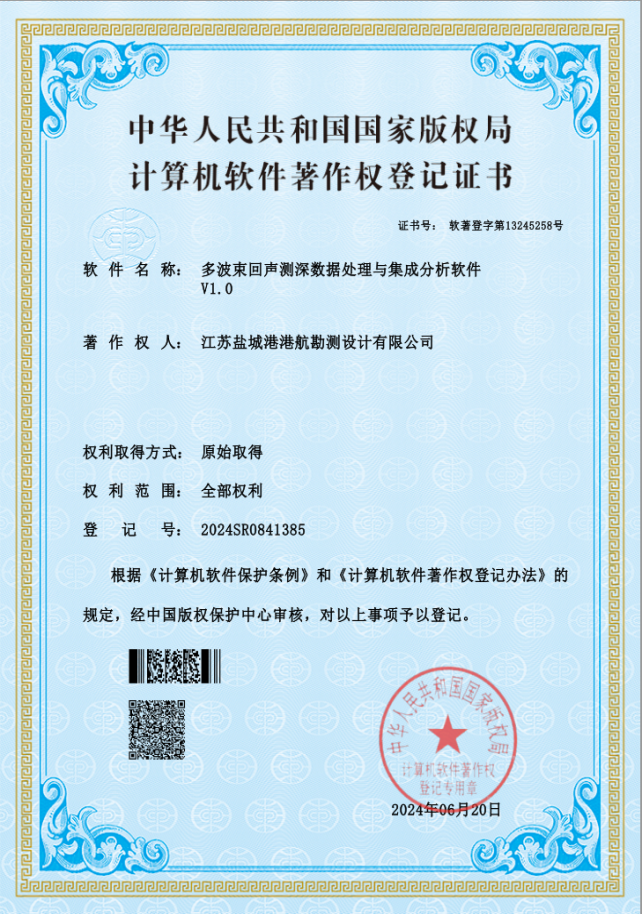 近日,根據(jù)《計算機軟件保護條例》和《計算機軟件著作權登記辦法》的規(guī)定,經中國版權保護中心審核,鹽城港港航勘測設計有限公司成功獲取《多波束回聲測深數(shù)據(jù)處理與集成分析軟件V1.0》《水環(huán)境智能分析系統(tǒng)V1.0》《遙感數(shù)據(jù)自動化處理平臺V1.0》三項軟件著作權,數(shù)個專利申請也同步推進中。