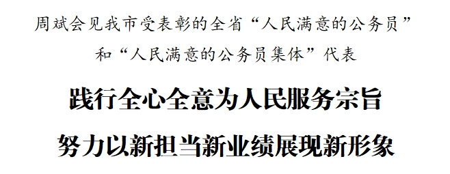 7月2日下午,市委書記周斌會見我市受表彰的第六屆全省“人民滿意的公務(wù)員”和“人民滿意的公務(wù)員集體”代表,代表市委、市政府向他們表示祝賀,并向奮戰(zhàn)在全市各條戰(zhàn)線上的廣大公務(wù)員致以誠摯問候。