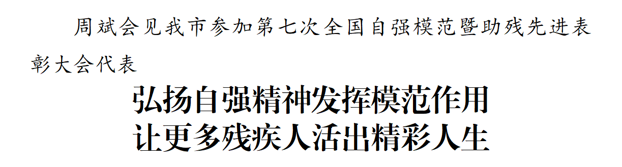 5月26日,市委書記周斌會(huì)見我市參加第七次全國(guó)自強(qiáng)模范暨助殘先進(jìn)表彰大會(huì)代表,向受表彰對(duì)象表示祝賀,向全市廣大殘疾人和殘疾人工作者致以問候,希望全市上下認(rèn)真學(xué)習(xí)貫徹習(xí)近平總書記關(guān)于殘疾人事業(yè)的重要指示精神,全面落實(shí)中央和省委部署要求,讓更多殘疾人活出精彩人生,在新征程上推動(dòng)我市殘疾人事業(yè)高質(zhì)量發(fā)展。