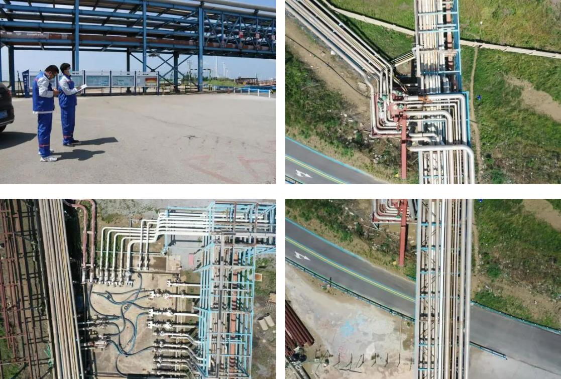 裝上機翼解鎖飛控,安全環保部同事操縱著無人機設備,對石化碼頭管線進行巡檢,隨著“嗡嗡”的急速飛行,無人機在管道高空不斷盤旋,俯瞰視角下,一覽無遺,解決了部分區域無法涉足的難題,實現巡檢區域無盲區全覆蓋。