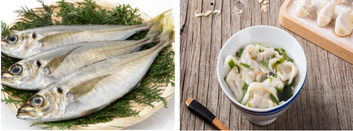 刀魚餛飩的制作主要是制皮和制餡。餛飩皮選用精白面粉加入蛋清和刀魚骨架湯代替水來和面。制成的皮,韌性足,味鮮,久煮不爛,晶瑩潤澤。制餡精選早春出水的新鮮肥碩的雌刀魚,口感細、滑、香、鮮,回味無窮。