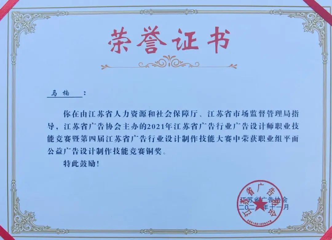 11月28日,從2021年江蘇省廣告行業廣告設計師職業技能競賽暨第四屆設計制作技能大賽上傳來好消息,由江蘇鹽城港文化傳媒有限公司選送的參賽選手,經過現場理論、實際創作等環節的比拼,在此次省級一類大賽中分別獲得職業組平面公益廣告設計銅獎、職業組影視公益廣告設計制作銅獎,為公司進一步提升品牌影響力增添了濃墨重彩的一筆,為“50天大比武活動”交上了一份優異的答卷。